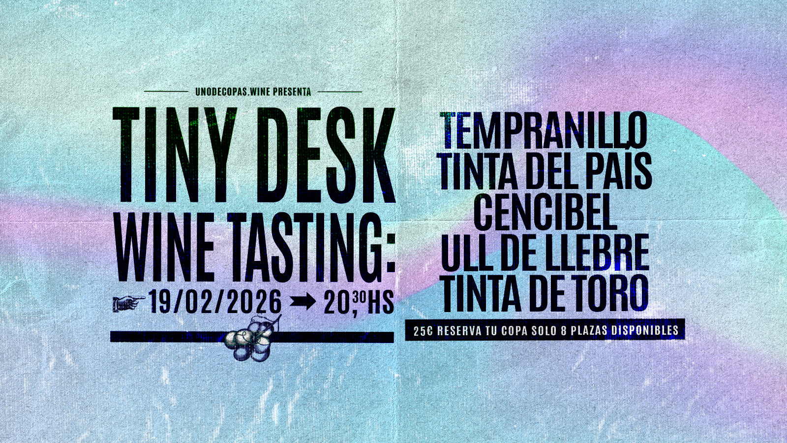 Nuestro próximo encuentro TINY DESK WINE TASTING, el Jueves 19 de febrero, lo dedicaremos a la uva tempranillo y todas sus denominaciones a lo largo y ancho de territorio Español.